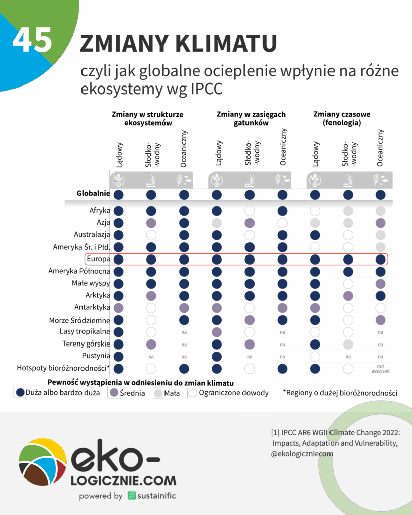 Na ostatniej infografice przedstawiłem wykres jak wg IPCC (Międzynarodowego Zespołu ds. Zmian Klimatu) zmiany klimatu wpłyną na naszą rzeczywistość w zależności od regionu, w którym żyjemy (prócz Europy i jeszcze jednego regionu wygląda to słabo, u nas wygląda to umiarkowanie). Jeżeli spojrzymy jednak z perspektywy ekosystemów, to sytuacja wygląda bardzo niekorzystnie dla wielu obszarów. „Najwięcej” zmian z dużym prawdopodobieństwem wystąpi w Europie oraz Ameryce Północnej.