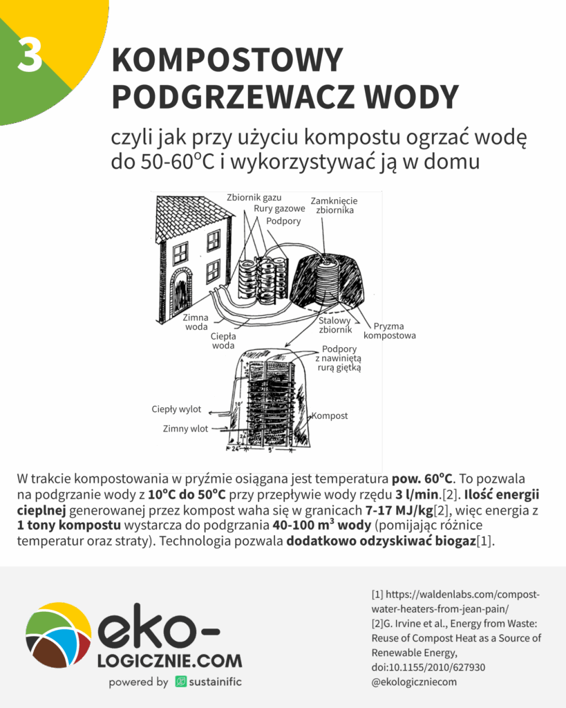 Pomysłodawcą użycia kompostu do ogrzewania domu był Jain Pain, który zaprezentował swój pomysł w latach 70′. Od tamtego czasu pojawiło się trochę prac – jedna z ciekawszych pokazuje zastosowanie takiego rozwiązania do ogrzewania gospodarstwa. W badanym przypadku została skonstruowana instalacja o średniej mocy 2,75 kW, zasilana ok. 50m3 odpadów roślinnych z gospodarstwa. Produkowała ona średnio 24MWh energii/rok, zaspokajając 34% potrzeb (reszta pochodziła z kotła na pellet). W badaniu oszacowano, że w całym cyklu życia sam proces będzie ujemny węglowo na skutek sekwestracji węgla w kompoście, który był zawracany na pole. Rozwiązanie wymagało uzupełniania biomasy co 12-18 miesięcy.
