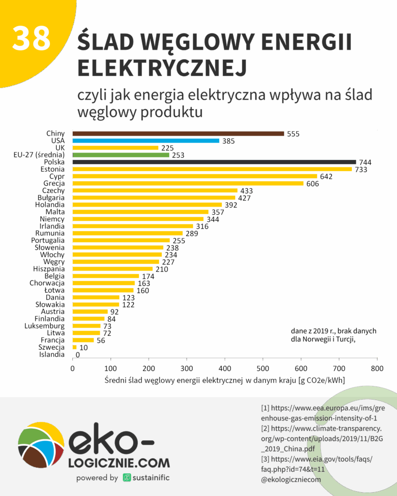 - trudno ocenić ekologiczność produktu (mierzoną poprzez ślad węglowy) bez znajomości ww. informacji – może się okazać, że ekologiczny produkt produkowany w kraju z wysokoemisyjną energią będzie gorszy niż produkt nieekologiczny w kraju z niskoemisyjną energią.