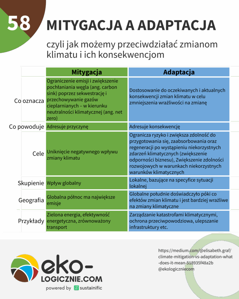Najprościej rzecz ujmując – możemy mitygować zmiany klimatu i adaptować się do zmian klimatu. W pierwszym przypadku zależy nam de facto na ograniczaniu zmian (walce z przyczynami), a w drugim przypadku skupiamy się na przystosowaniu do nowej rzeczywistości (walczymy z konsekwencjami).