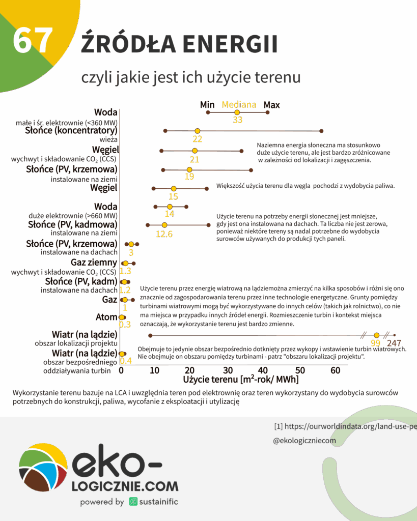Niniejszy wykres uwzględnia cały cykl życia produktów, w tym również użycie terenu w celu wydobycia niezbędnych surowców. Na tej podstawie widać, dużą zmienność użycia energii słonecznej, w zależności od sposobu instalacji. W przypadku wiatru różnice z kolei zależą od sposobu zdefiniowania czym jest użycie terenu – czy mówimy o obszarze lokalizacji projektu, czy o terenie, na którym wiatraki są zainstalowane.