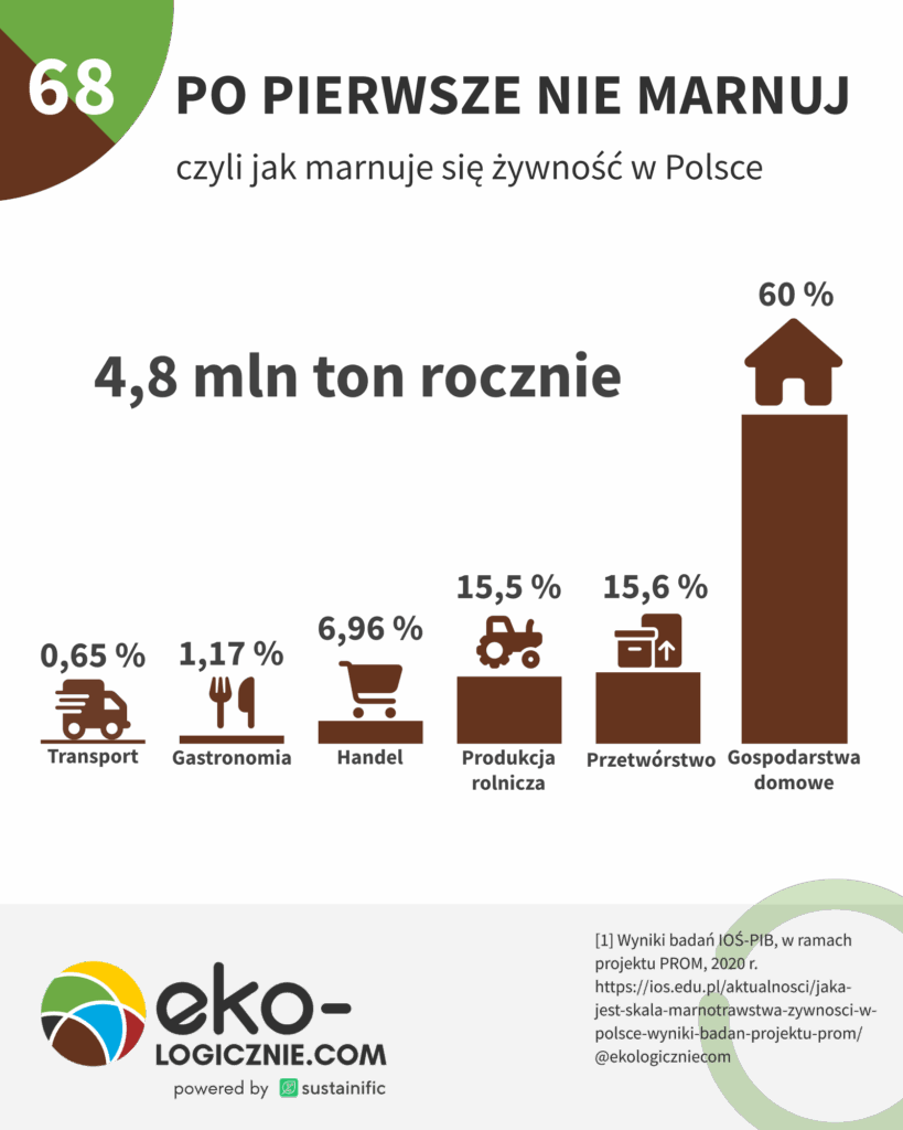 Jak wynika z badań przeprowadzonych przez zespoły badawcze z Instytutu Ochrony Środowiska i Szkoły Głównej Gospodarstwa Wiejskiego, w Polsce marnuje się rocznie prawie 5 mln ton żywności, przy czym za 60% odpadów odpowiadają konsumenci, co odpowiada ok. 80 kg/osobę rocznie.