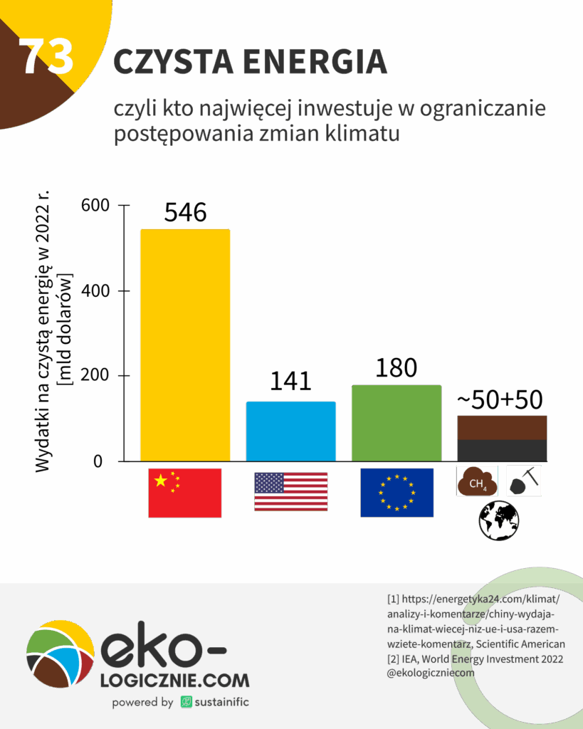 Kiedy następnym razem ktoś z Waszego otoczenia (np. kolega z pracy, sąsiad, wujek) powie Wam, że Unia Europejska zakłada sobie kaganiec i pada na kolana, oraz że to złe Chiny i USA wszystko emitują – pokażcie im ten wykres. Wydatki Chin na czystą energię są prawie 2 razy większe niż sumaryczne wydatki USA i Unii Europejskiej, są również 5 razy większe od globalnych inwestycji w energię z węgla i gazu ziemnego.