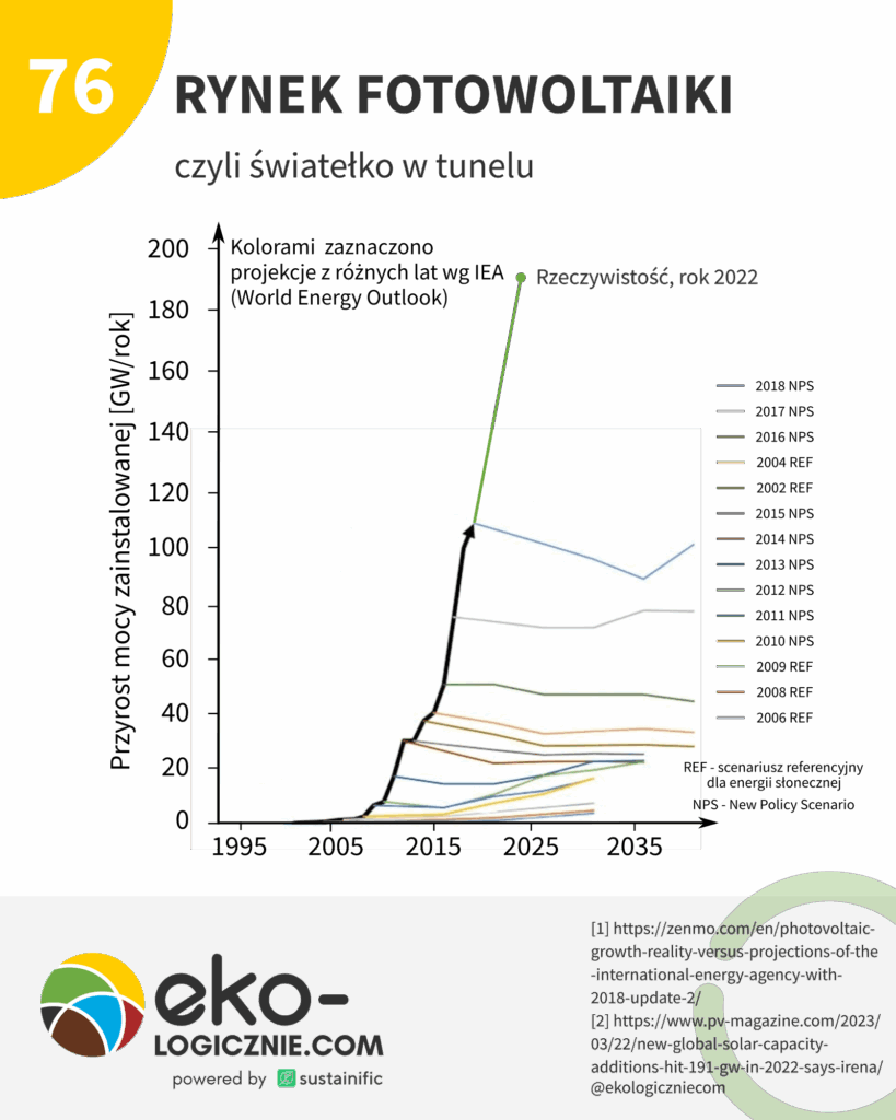 – przez ostatnie 17 lat przyrost mocy zainstalowanej mocno rozjeżdża się z projekcjami przygotowywanymi Międzynarodową Agencję Energetyki (IEA)